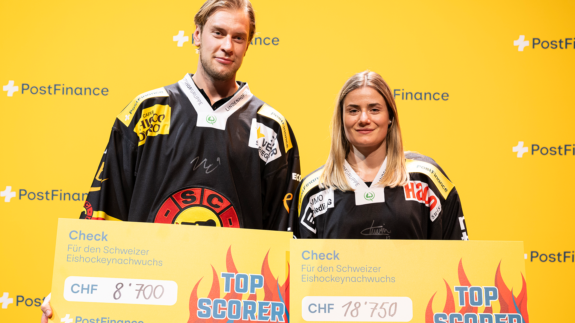 Estelle Duvin und Victor Ejdsell sind die PostFinance Top Scorer 2026 des SCB. Sie erspielen zusammen 27’450 Franken für den Nachwuchs. Beide wurden an der Top-Scorer-Ehrung am 11. März 2026 in der Festhalle in Bern für ihre Leistungen ausgezeichnet.